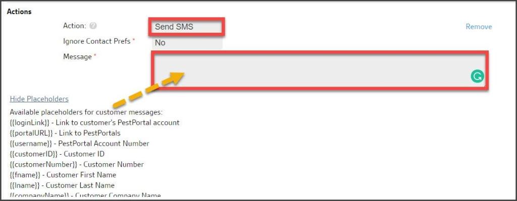 - Placeholders: The available placeholders for dynamic content in the SMS message. Toggle between Hide/View Placeholders to review options.