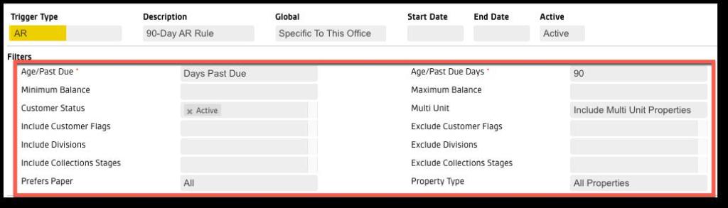 - Age/Past Due (days): The number of days to trigger the rule Note: This configuration works in conjunction with the above filter.