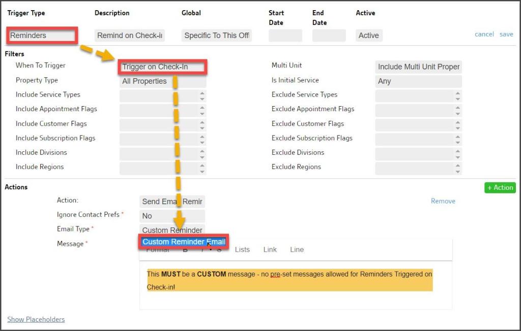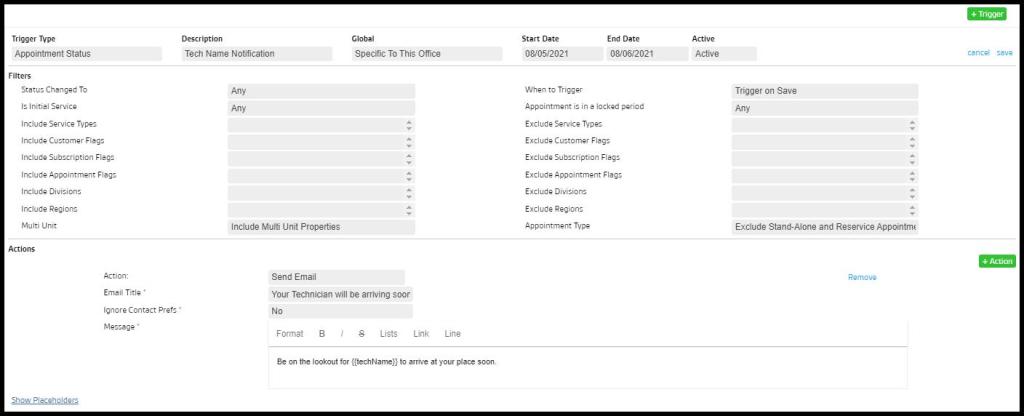 - Trigger on Check-in: Message is sent when the technician checks in on the Appointment.