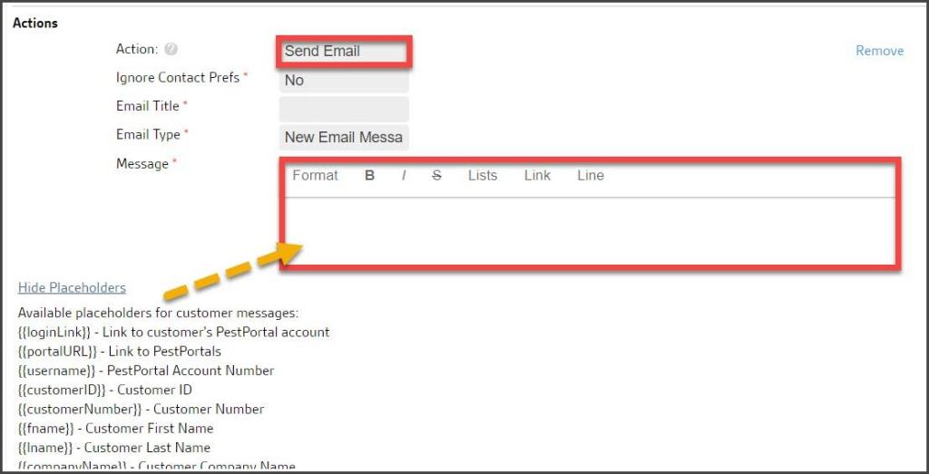 The available placeholders for dynamic content in rules. Toggle between Hide/View Placeholders to review options. See the Rule actions below for more details