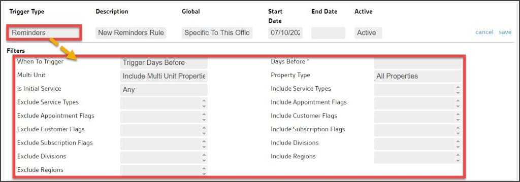 - Rescheduled: Triggers the rule action when an appointment is moved to a new time/day/technician’s route or the Reschedule option is used in the web or Mobile app.