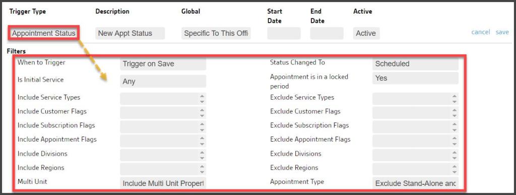 A set of special filters becomes available only for Appointment Status rules when an Appointment Status changes to Canceled.
