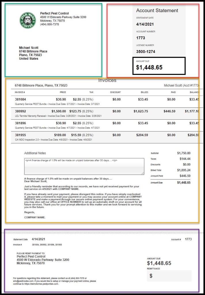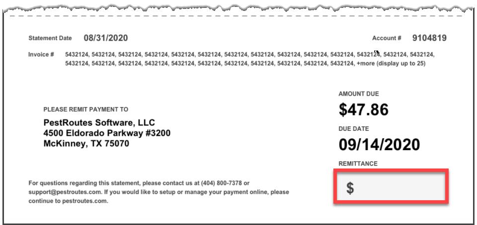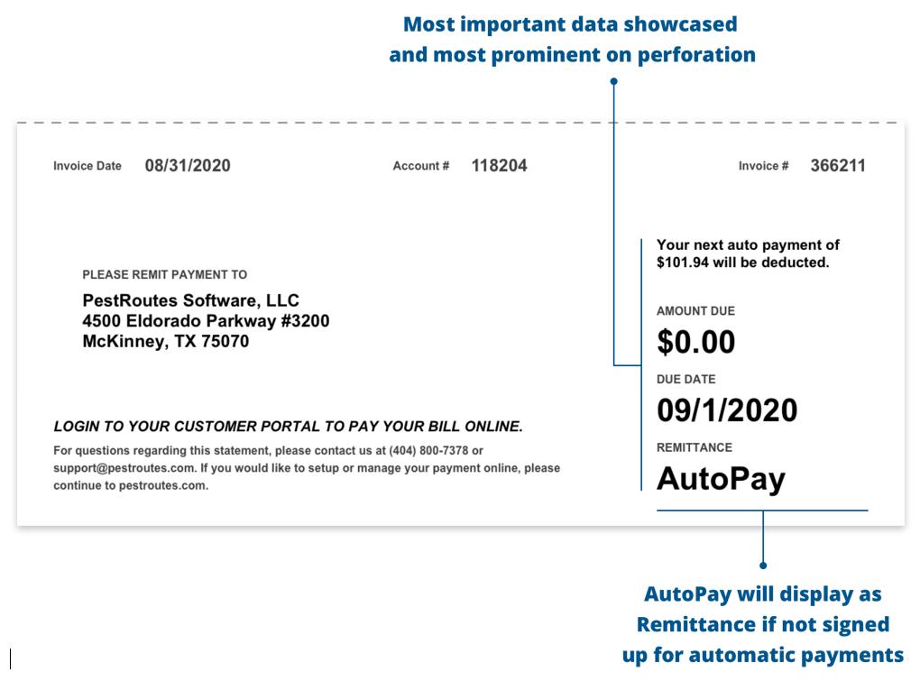 On the form, the lower portion of the Account Statement is separated by a dotted line representing a perforated Remittance tear-off section that could be removed and returned with a customer payment if a paper check is sent. As in the summary box at the top of the document, the perforation section shows only the most important information: