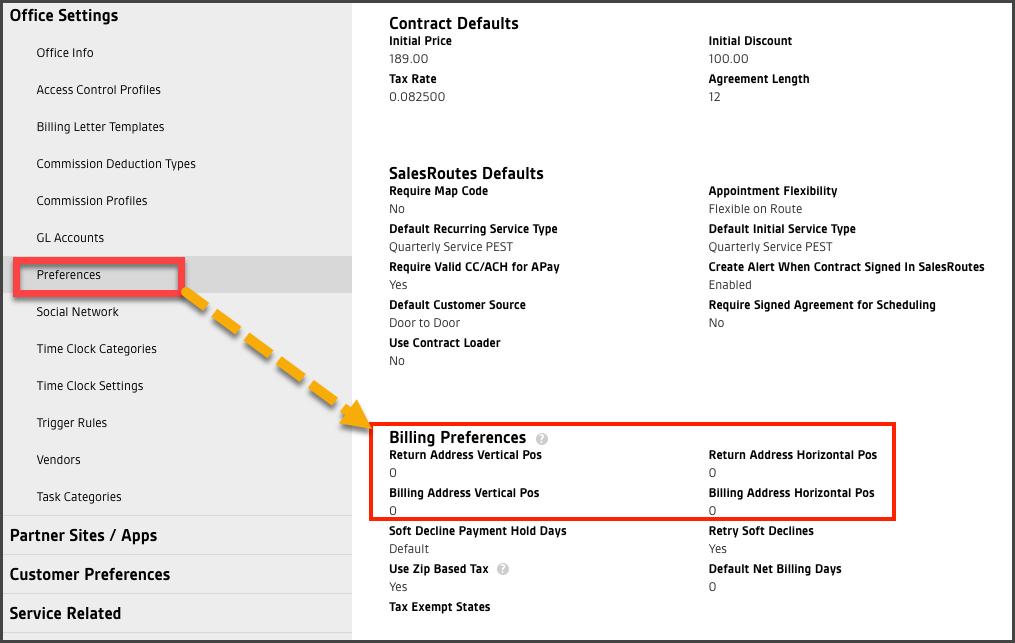 Under the Billing Preferences area, increase or decreases the values of the Return Address and Billing Address Vertical Pos and Horizontal Pos settings as needed. Save the settings once the respective addresses print in the correct position to view through the envelope windows.