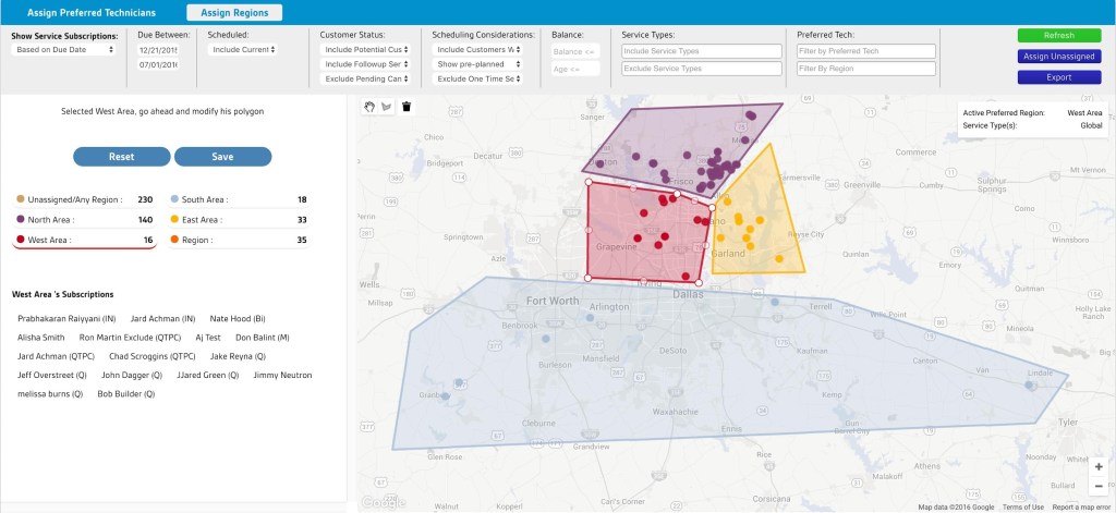 - You can move or remove customers from their assigned region or tech.
